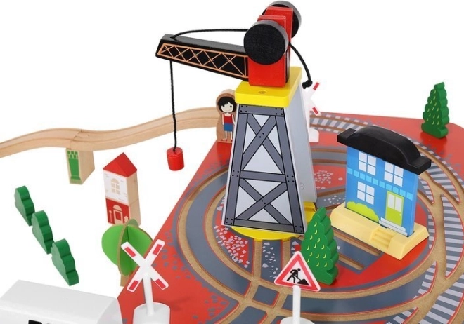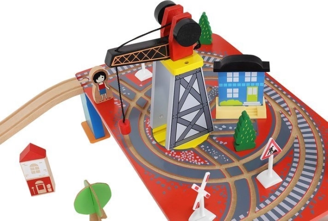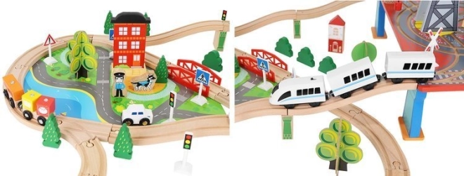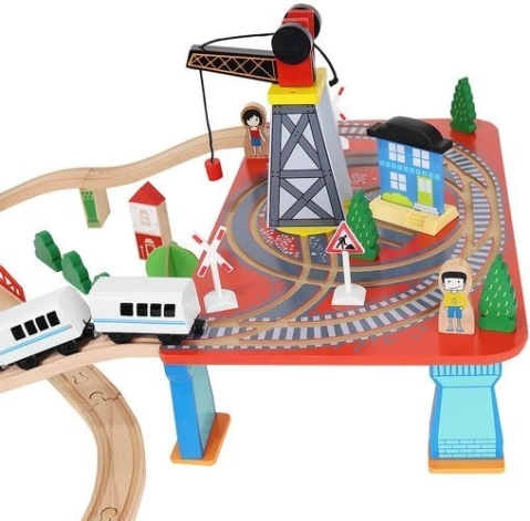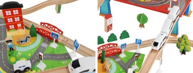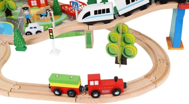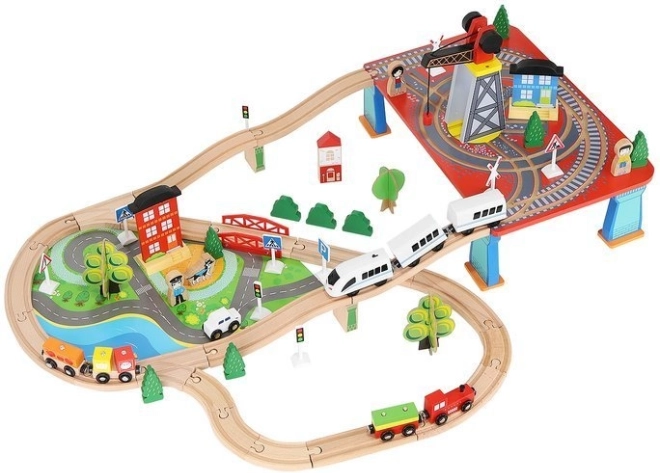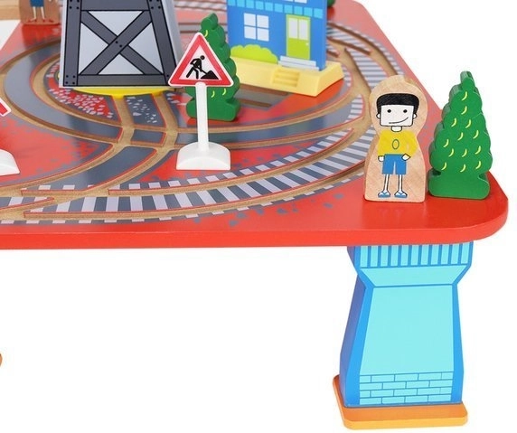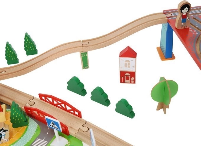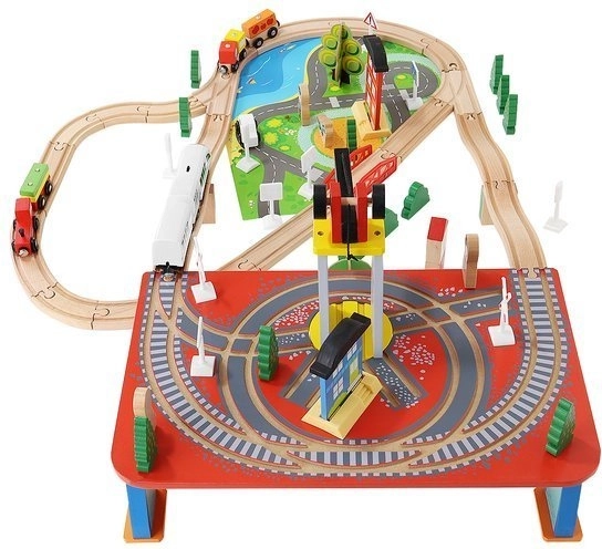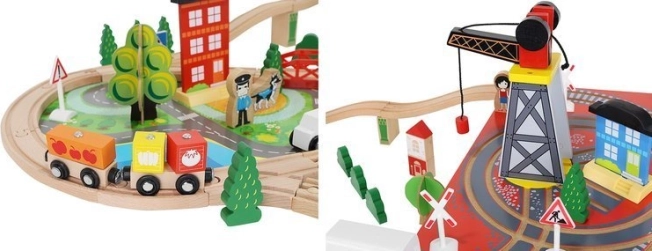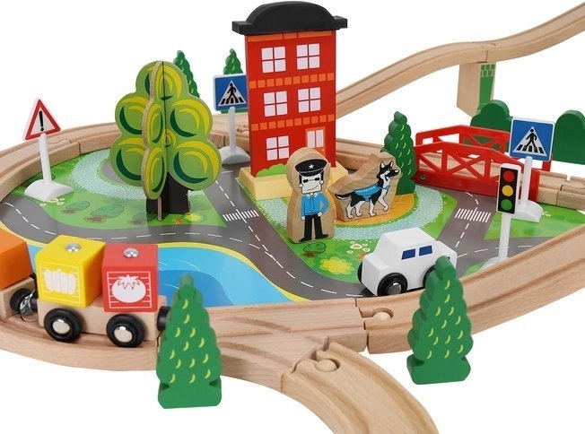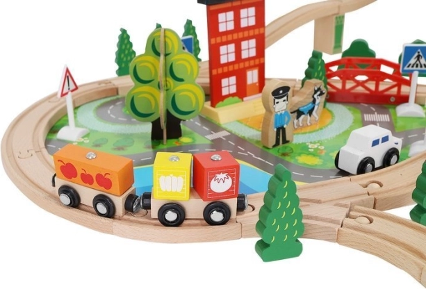 Dřevěná vláčkodráha s celkem 88 precizně vyrobenými prvky, včetně železnice, nákladního a osobního vlaku, automobilu, stromků a dopravních značek. Zábava spočívá v možnosti vytvořit si vlastní trasu, zatímco magnetické spojení jednotlivých částí zajišťuje snadnou obsluhu.