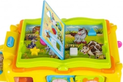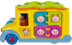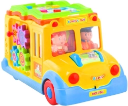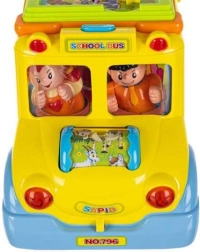 V přední části se nachází zelený váleček se zvířátky, který se po přetočení spustí a začne svítit, vydávat zvuky a hrát další melodie. Na střeše autobusu je poležena knížečka s tlačítky v různých barvách a tvarech - po jejich stlačení uslyšíte zvuk nakresleného zvířátka – kůň, kačenka, kohout, žába, kráva, ptáček, kočka, tygr, pes a koza.