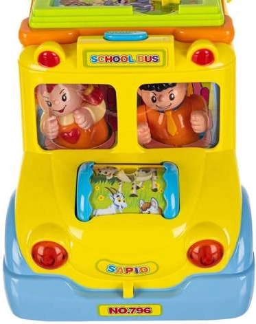 V přední části se nachází zelený váleček se zvířátky, který se po přetočení spustí a začne svítit, vydávat zvuky a hrát další melodie. Na střeše autobusu je poležena knížečka s tlačítky v různých barvách a tvarech - po jejich stlačení uslyšíte zvuk nakresleného zvířátka – kůň, kačenka, kohout, žába, kráva, ptáček, kočka, tygr, pes a koza.