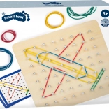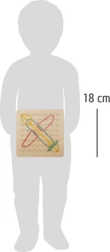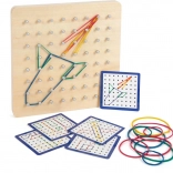 Dřevěná tabule Geoplan je vybavena 64 rovnoměrně rozmístěnými kolíky na pevné dřevěné základně o rozměrech 18 x 18 x 2 cm. Díky 48 barevným gumičkám mohou děti vytvářet nekonečné množství vzorů a obrazců od jednoduchých geometrických tvarů po složité kompozice. Součástí sady je také 23 vzorových karet, které pomáhají procvičovat prostorové plánování a logické myšlení.