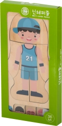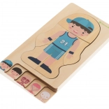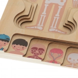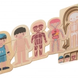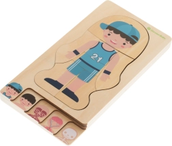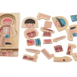 Sada obsahuje dřevěnou základnu a 28 jednotlivých dílků, které se skládají od skeletu až po oděv postavy. Díky jednoduchému designu a přírodním materiálům puzzle podporuje principy Montessori metodiky, která se zaměřuje na komplexní výuku dítěte.