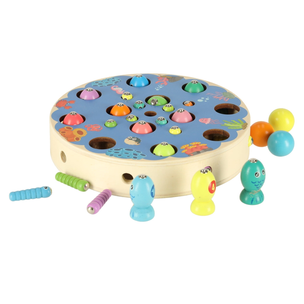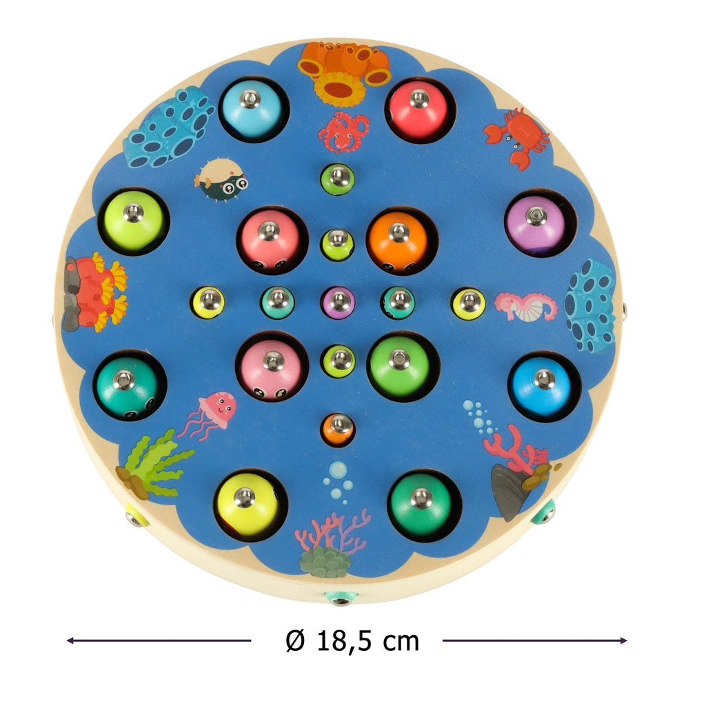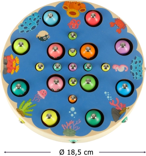 Multifunkční montessori sada přináší dětem hodiny tvořivé zábavy i učení. Na kulaté dřevěné základně s oceánským motivem děti chytají magnetické rybky na pruty, vytahují housenky, přenášejí kuličky pomocí pinzety či hůlek a procvičují barvy, třídění a trpělivost. Díky bohatému příslušenství mohou hrát i ve více dětech.