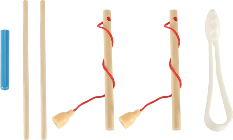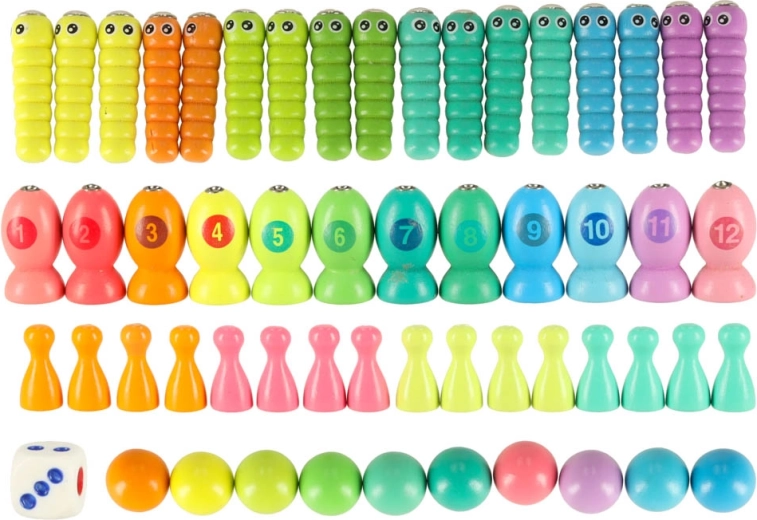 - 1× dřevěná základna, 2× prut, 2× hůlky, 1× pinzeta, 4× silikonová mistička, 10× dřevěná kulička, 12× rybka, 17× housenka, 16× pěšák ve 4 barvách, 1× kostka