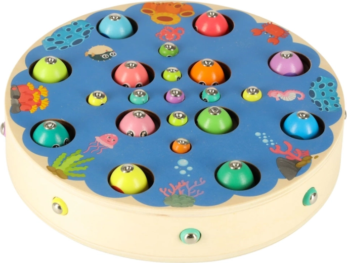 Děti chytají barevné rybky a housenky magnetickými pruty – trénují přesnost, trpělivost a koordinaci oko‑ruka zábavnou formou.
