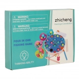 - Různé herní režimy: magnetické lovení rybiček a housenek, přenášení pinzetou/hůlkami, třídění barev, jednoduché příklady s čísly, cvičení počítání formou deskové hry.