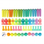 Díky velkému množství dílků je hra ideální i pro více dětí současně – jeden loví rybičky, druhý sbírá housenky a další třídí kuličky do silikonových misek. Bezpečné materiály a hladce broušené dřevo zajišťují pohodlné a bezstarostné hraní.