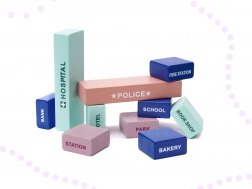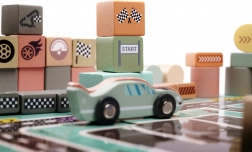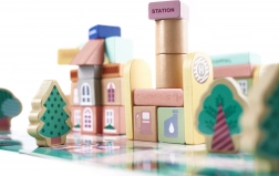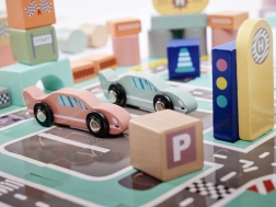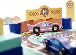 Každé město potřebuje ulice a auta – a tento set obsahuje puzzle, které když jsou složeny, vytvoří hrací plochu s tratí. Najdete zde různé prvky jako budovy, postavy a vozidla. Kostky jsou vyvedeny v pastelových barvách, což nejen podněcuje zrakové vnímání dítěte, ale také jeho logické a netradiční myšlení.