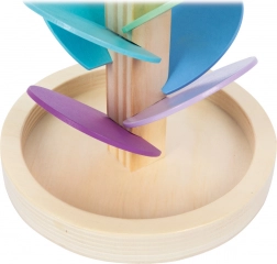 Každý barevný lístek má jinou velikost a při kontaktu s kuličkou vytváří postupně vyšší až nižší tóny. Děti tak trénují sluch, soustředění i trpělivost.