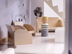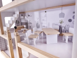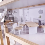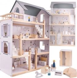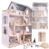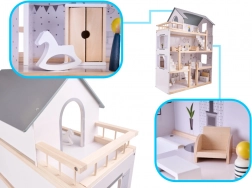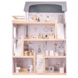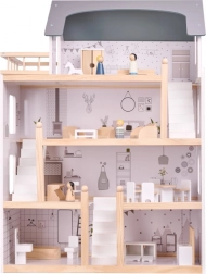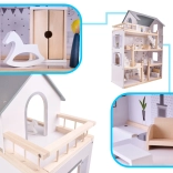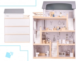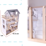 Dřevěný domeček pro panenky s jemnou kombinací bílé a přírodního dřeva zaujme moderním vzhledem, pevným provedením a promyšleným členěním prostoru. Čtyři prostorná podlaží s terasou nabídnou dost místa i pro větší panenky, takže se do hry může zapojit celá „rodina“.