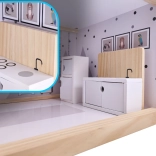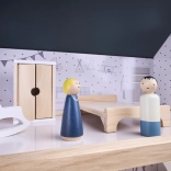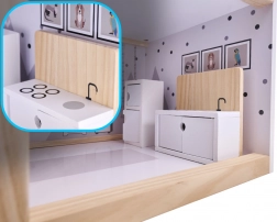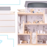 Každá místnost je vybavena stylovým nábytkem – od koupelny přes jídelnu s kuchyňským koutem až po ložnici a pracovní koutek. Domeček je ideální pro společnou hru sourozenců, rozvíjí sociální role a přirozeně podporuje jemnou motoriku i fantazii.