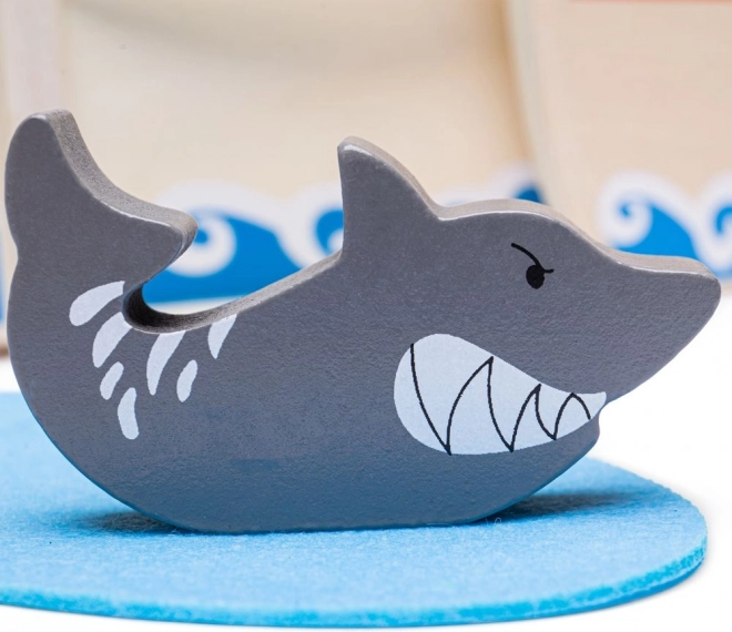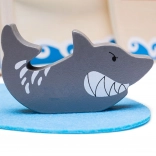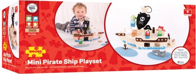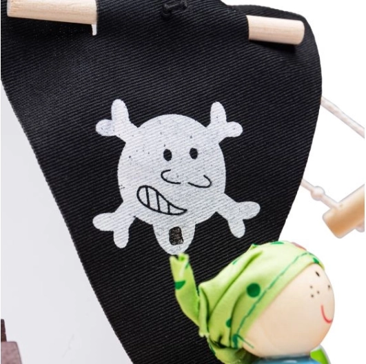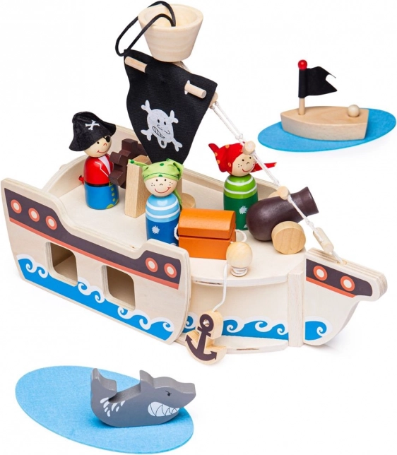 Tato dřevěná sada pirátské lodi obsahuje vše, co malí piráti potřebují ke svým dobrodružstvím. Balení zahrnuje kapitána, dva piráty, loď, kotvu, truhlu s pokladem a žraloka. Všechny hrací prvky lze prakticky umístit do lodi, takže je ideální pro cestování a snadné přenášení.