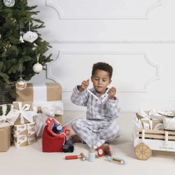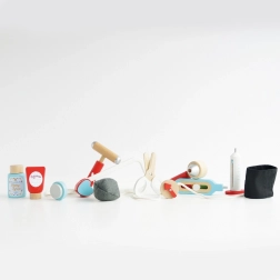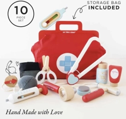 Stylová doktorská sada pro malé lékaře a lékařky v textilní brašně s dřevěnými uchy přináší vše potřebné pro hru na ordinaci. Obsahuje celkem 10 dílů včetně stetoskopu, teploměru a injekční stříkačky. Hračka je genderově neutrální, podporuje jemnou motoriku, představivost a kognitivní dovednosti. Vyrobeno z udržitelného dřeva s certifikací FSC a ručně domalováno netoxickými barvami na vodní bázi.