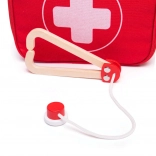 Set je vyroben z materiálů z odpovědných zdrojů a splňuje současné evropské bezpečnostní normy. Díky dřevěným prvkům, měkkým textiliím a hladkým okrajům je hraní bezpečné a příjemné. Ideální dárek pro malé doktory od 3 let.
