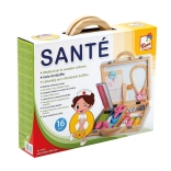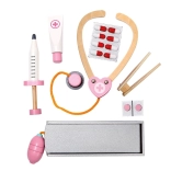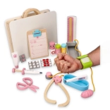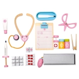 Součástí setu jsou dřevěné nástroje jako stetoskop, injekční stříkačka a další pomůcky, které podporují realistickou hru.