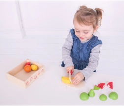 Realistické prkénko a dřevěný nůž podporují hru na kuchaře bez rizika. Dílky ovoce drží pohromadě a při krájení se snadno oddělí.