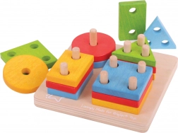 Tato dřevěná vkládačka se základnou s kolíky a pestrobarevnými geometrickými tvary (kruhy, čtverce, trojúhelníky, obdélníky) nabízí dětem radost z objevování a učení. Při nasazování jednotlivých dílků si děti procvičí úchop, koordinaci ruka–oko i logické myšlení, zároveň přirozeně trénují rozlišování barev a tvarů a první počítání.