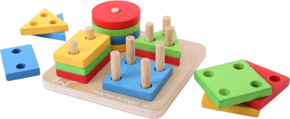 Pestrobarevné kruhy, čtverce, trojúhelníky a obdélníky podporují rozlišování barev a tvarů. Kolíky a dílky pomáhají s raným počítáním.