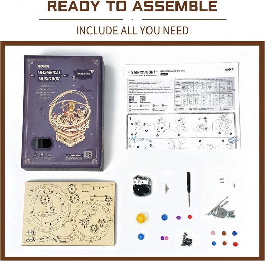 Hvězdná noc je poctou historickým modelům orrery. Po natažení se díky chytrému převodovému soukolí a poledníkovému kruhu planety elegantně otáčejí a vytvářejí plynulý, uklidňující pohyb. Jednotlivé díly z 2 mm lipové překližky jsou přesně laserem řezané a snadno se vylamují přímo z archů.
