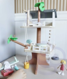 Balení obsahuje 31 prvků včetně 2 dětských figurek, 2 zvířátek a doplňků jako houpačka, houpačka–pneumatika, houpačka–rovnováha, postel, stůl, židle a truhla s pokladem. Pečlivě opracované přírodní dřevo s jemnými barvami je odolné a příjemné na dotek.