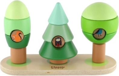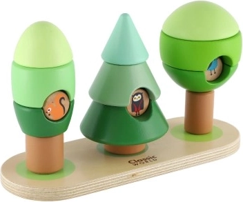 Tato roztomilá lesní skládanka přináší dětem radost z objevování tvarů, barev a jednoduchých principů skládání. Z jednotlivých dílků vznikají tři zelené stromy a každý z nich ukrývá jiné zvířátko – sovu, datla a veverku. Díky pevnému dřevu a příjemnému provedení se sadu snadno drží i nejmenším ručkám.