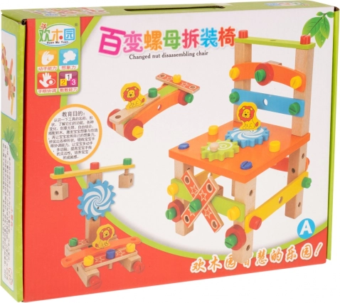 Tato kvalitní dřevěná sada umožní dětem sestavit dílenskou židličku i další originální modely. Díky šroubkům, matičkám a ozubeným kolečkům děti zkoumají principy jednoduché mechaniky, trénují soustředění a zručnost. Židlička je stabilní a díky promyšlenému systému otvorů a spojů nabízí spoustu kombinací.