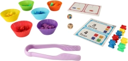 - 36 medvídků (6 barev), 6 silikonových kelímků, 2 dřevěné kostky, 16 oboustranných karet s úkoly, pinzeta