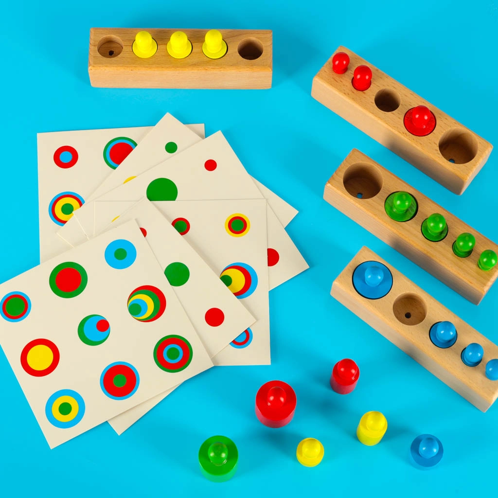 Dřevěná montessori skládačka s barevnými válci. Rozvíjí motoriku, logiku a učení barev i počítání. Bezpečné dřevo, netoxické barvy, mnoho způsobů hry.