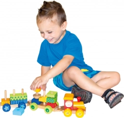 Multifunkční dřevěný vláček je nejen tahací hračkou, ale také stavebnicí, která dětem umožní rozvíjet jejich kreativitu. Součástí vláčku jsou tři podvozky a 18 různých kostek, které lze skládat podle fantazie.