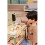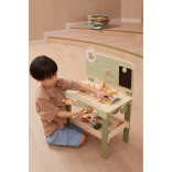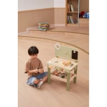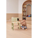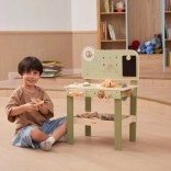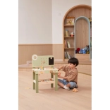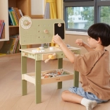 Stylový dětský ponk v přírodně‑zeleném provedení nabízí realistický zážitek z dílny v bezpečné, dřevěné podobě. Děti mohou šroubovat, měnit kolečka u autíčka, "řezat" dílky, skládat ozubená kola a objevovat principy příčiny a následku. Díky přehlednému úložnému prostoru zůstanou všechny díly a nářadí vždy po ruce.