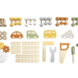 - Bohaté příslušenství: nářadí, šrouby, matice, destičky, ozubená kola, autíčko a hodiny s ručičkami.