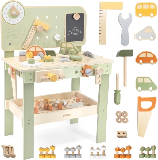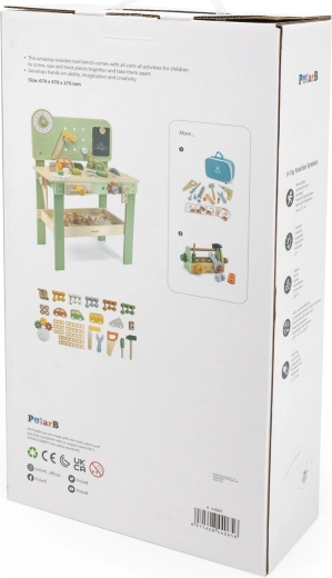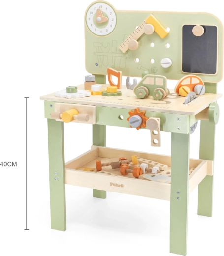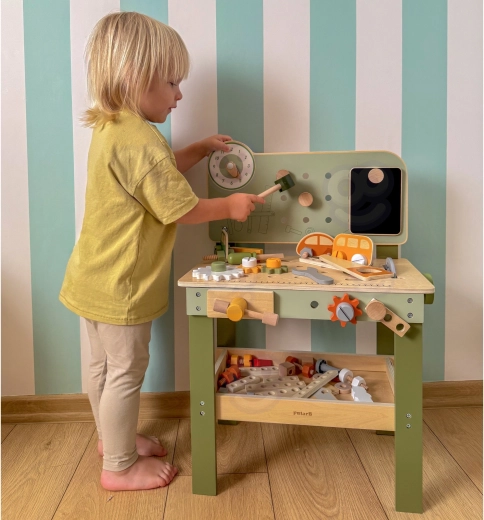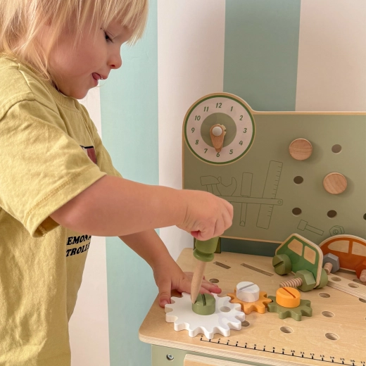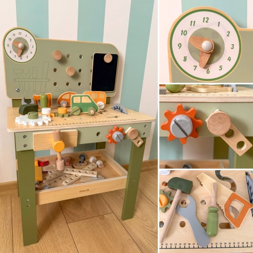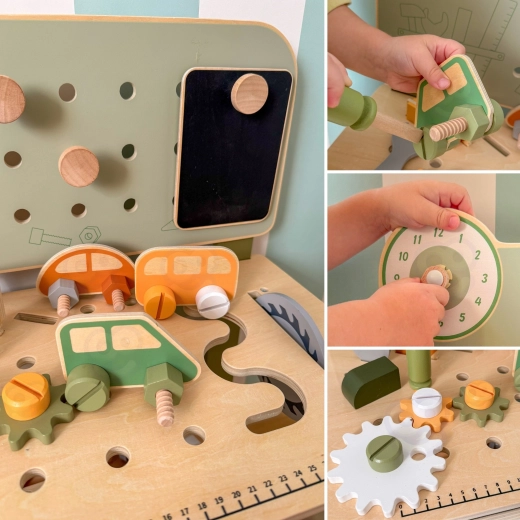 Součástí je sada nástrojů (kladívko, klíč, šroubovák), šroubky, matice, ozubená kola, panel s učebními hodinami a praktická polička na odkládání. Děti mohou sestavovat vlastní výtvory, „opravovat“ a třídit díly – ideální pro rozvoj kreativity, trpělivosti a plánování.
