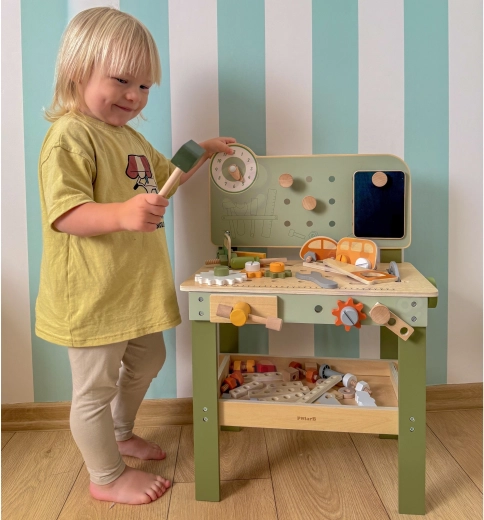 Ponk s pegboardem, měřicí stupnicí a otočnými prvky podporuje realistickou hru a rozvoj dovedností při práci s nářadím.