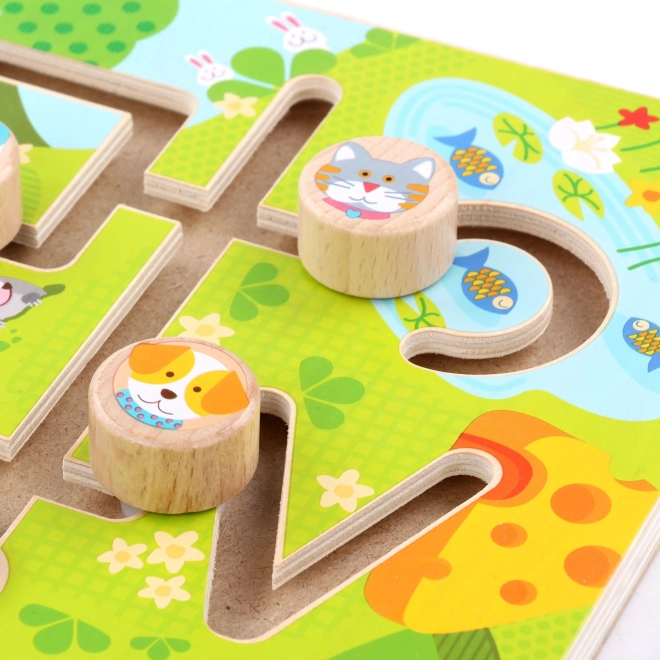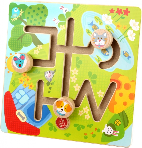 Dřevěný labyrint Slunné údolí přináší dětem radost z objevování i učení. Ilustrovaná hrací deska s rybníkem a zelení vtáhne děti do hry, kde pes, kočka a myška putují ke svým cílům. Díky plynulým drážkám se figurky snadno posouvají a hra je tak bezpečná a intuitivní.