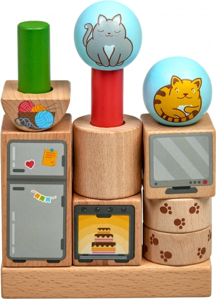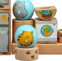 - Pevné dřevěné díly s veselými ilustracemi koček a domácnosti