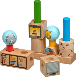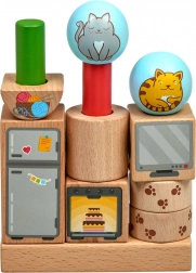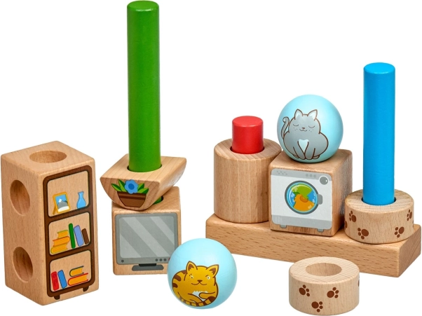 Odolné dřevěné tvary s jemně broušeným povrchem a ilustrovanými motivy kočiček a předmětů. Ideální pro malé dětské ruce.