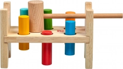 Šest barevných kolíků a dřevěné kladívko učí děti přesnému úchopu, síle úderu a koordinaci oko–ruka.