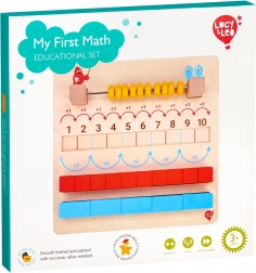Dřevěná vzdělávací sada pro první krůčky v matematice od LUCY & LEO rozvíjí logiku, počítání a jemnou motoriku formou hry. Obsahuje hladkou dřevěnou desku s počítadlem a drážkami pro kostky, 10 červených kostiček a 5 modrých kvádrů pro základy sčítání a odčítání. Bezpečné provedení a odolné materiály jsou ideální pro děti od 3 let.
