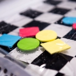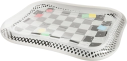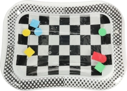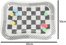 Objevte kontrastní vodní podložku, která nejen zaujme vaše dítě, ale zároveň podporuje jeho senzorický a motorický vývoj. Tato podložka s černobílým šachovnicovým motivem obsahuje plovoucí barevné geometrické tvary, které se pohybují při dotyku dítěte.
