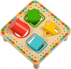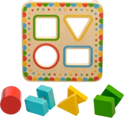 Deska na stabilních nožičkách má čtyři barevně orámované otvory, které ladí s barvami jednotlivých dílků. Sada je ideální pro samostatnou hru i společné objevování s rodiči a skvěle se hodí jako kvalitní dřevěná edukativní hračka pro předškoláky.