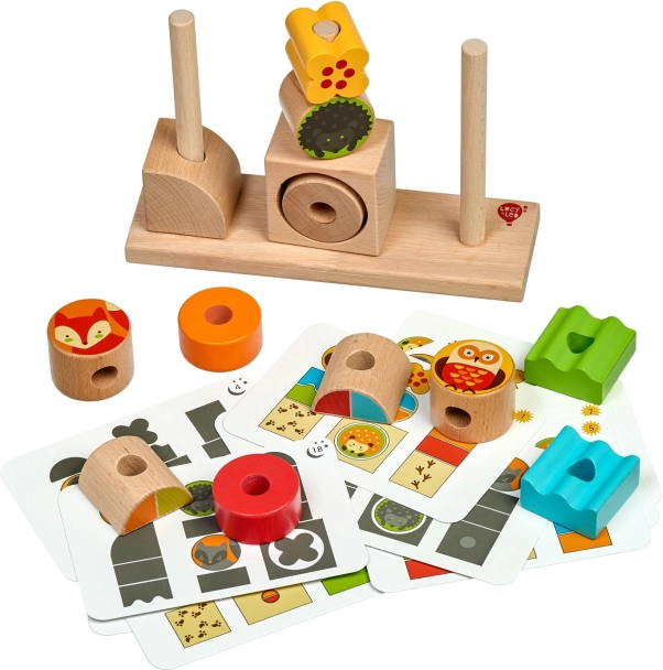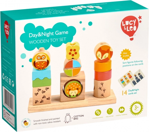 Set obsahuje pevnou dřevěnou základnu, rozmanité kostky různých velikostí a 14 oboustranných karet s výzvami. Na zvířátkových kostkách jsou motivy ve verzi „den“ a „noc“, což přidává hře příběhový rozměr. Po hraní vše snadno uložíte do lněného sáčku.