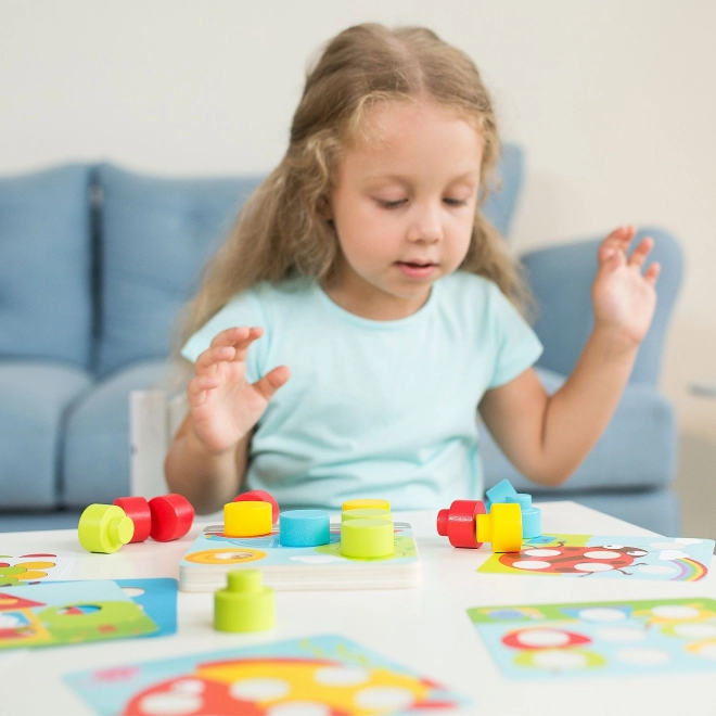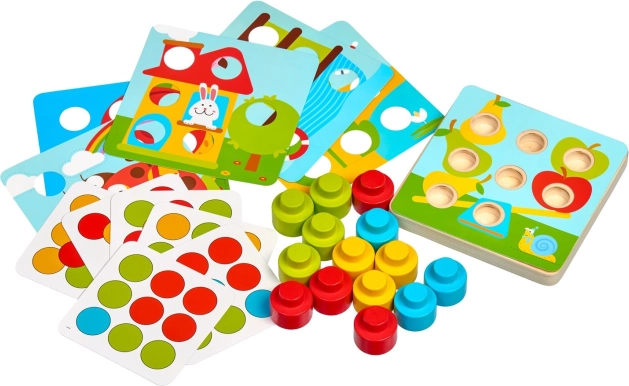 Velké dřevěné kolíky se snadno uchopují a vkládají do otvorů, což podporuje koordinaci oko–ruka a učení barev přirozenou hrou.