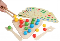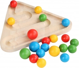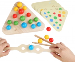 Objevte kreativní zábavu a učení v jednom. Dřevěná oboustranná deska v trojúhelníkovém tvaru přináší dvě aktivity: třídění barevných kuliček podle 20 předloh pomocí přiložené pinzety a lžíce, a dynamické bludiště, ve kterém děti procvičí trpělivost i přesnost. Barevné kuličky se po hraní ukládají do lněného sáčku, takže je vše hezky pohromadě.