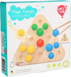 Oboustranná dřevěná hra Magický trojúhelník 2v1 od LUCY & LEO rozvíjí jemnou motoriku, logické myšlení, koordinaci oko–ruka a paměť. Nabízí dvě varianty hry – třídicí hru s kartami předloh a bludiště – a je skvělou Montessori pomůckou pro děti.
