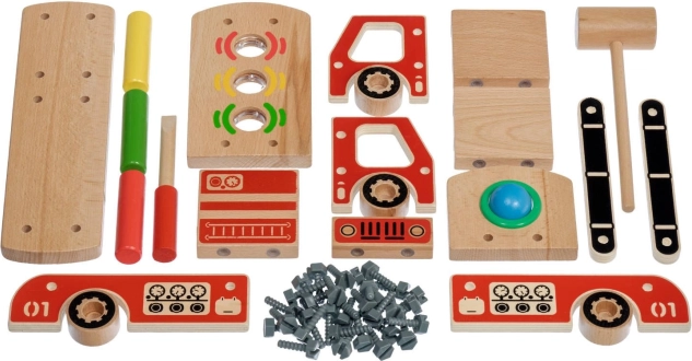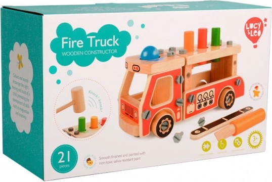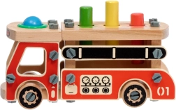 Sestavte funkční dřevěné hasičské auto se šrouby a nářadím. Proces stavby podporuje logické myšlení a trpělivost.