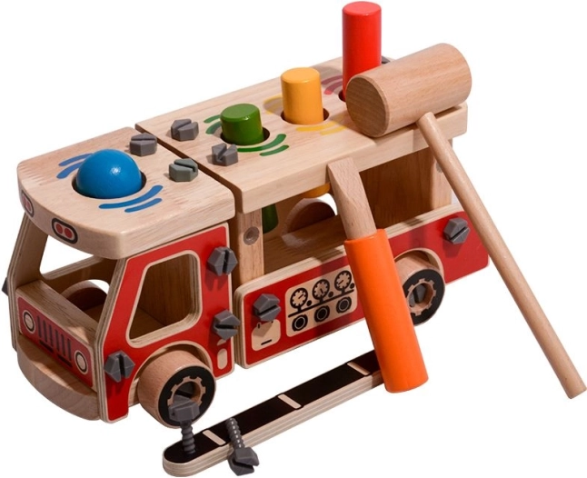 Tento kreativní set kombinuje stavebnici a zatloukačku v jednom. Děti si nejprve sestaví robustní hasičské auto ze dřeva a poté na jeho korbě využijí čtyři otvory k zábavnému zatloukání barevných prvků kladívkem. Díky jasným barvám a rozmanitým tvarům hračka podporuje přirozené učení a soustředění.