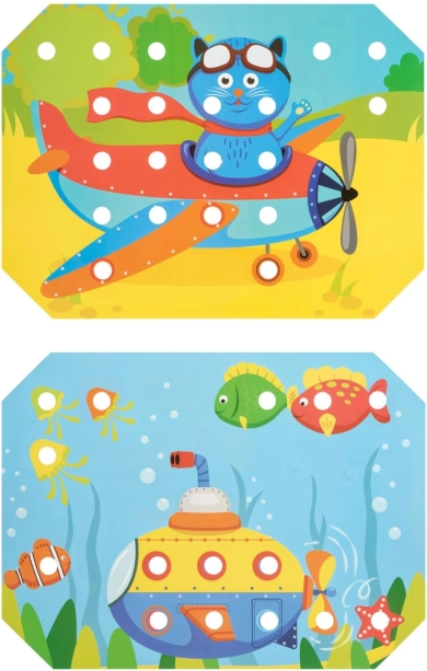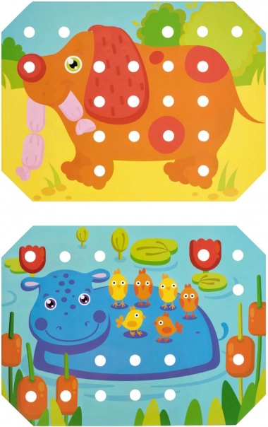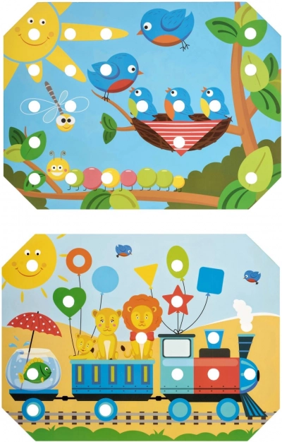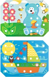Děti si vyberou jednu z barevných předloh, položí ji na dřevěný podstavec a obrázek vyplňují kolíčky pomocí pinzety nebo rukou. Mohou také trénovat šněrování a vyšívání pomocí přiložených tkaniček. Hra přirozeně podporuje soustředění, logiku, trpělivost a přesnost.