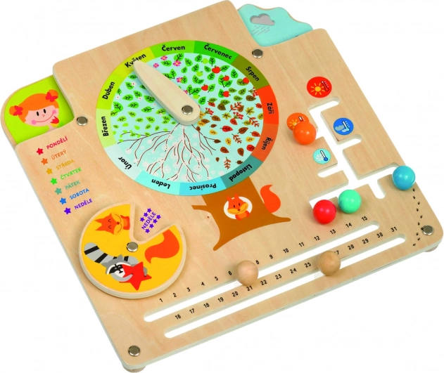 Dřevěný kalendář přírody LUCY & LEO je ideální pomůcka pro hravé učení. Uprostřed desky najdete listnatý ovocný strom s ukazatelem 12 měsíců, díky kterému si děti snadno spojí zimu se sněhem, jaro s květy, léto s ovocem a podzim s opadávajícími listy. Děti se zároveň učí poznávat dny v týdnu, počet dní v měsíci, počasí, teplotu a vhodné oblečení pro různé podmínky.