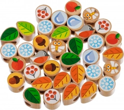 Tento kvalitní dřevěný set přináší dětem zábavné provlékání a šněrování na pevné stromové desce se stojánkem. Součástí jsou barevné dílky (listy, květy, bobule, žaludy, ovoce, vločky, hmyz aj.) a několik šňůrek pro nekonečné variace. Dílky lze po hře uložit do praktického lněného sáčku.