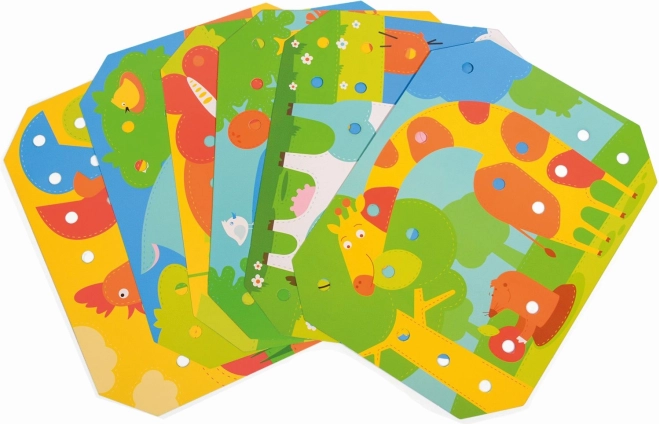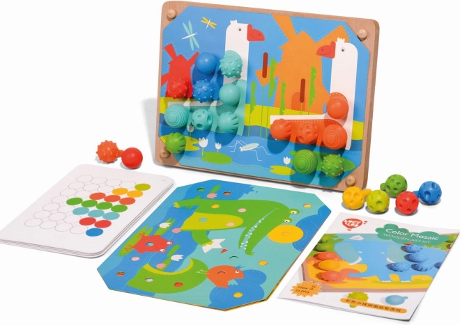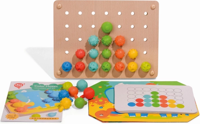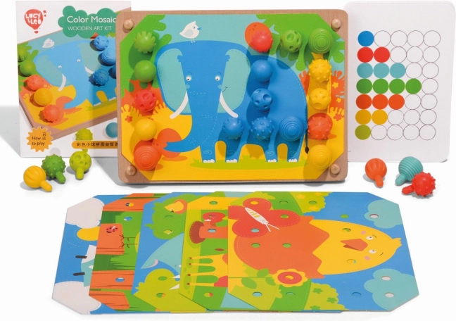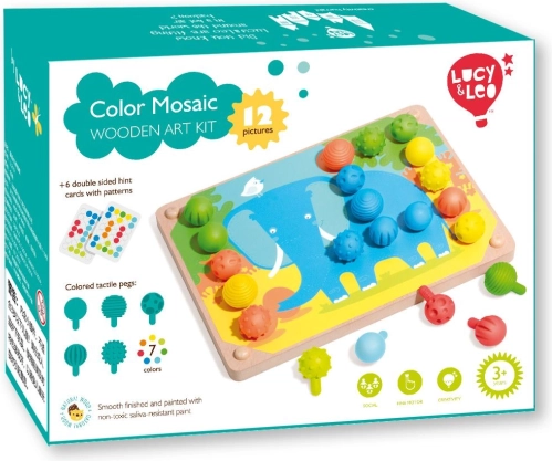 Mozaika a vyšívání je skvělým nástrojem pro malé děti k rozvoji jemných motorických dovedností a kreativity. Obsahuje 35 velkých silikonových kolíčků v sedmi vibrantních barvách, které děti mohou využít k vyplňování barevných předloh. Set rovněž obsahuje 12 barevných obrázků se zvířaty a 6 oboustranných šablon.