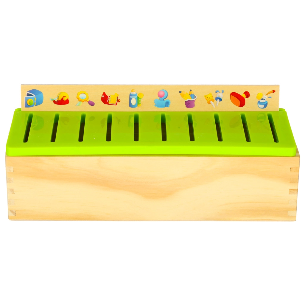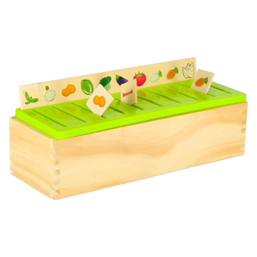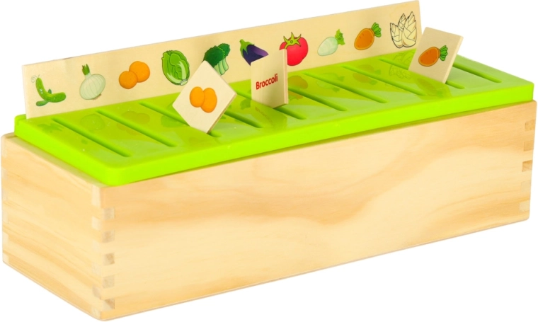 Vzdělávací sorter je promyšlená dřevěná skříňka s větraným zeleným víkem a sadou velkých tématických desek (čísla, tvary, zvířata, ovoce a zelenina, dopravní prostředky aj.). Děti přiřazují malé dřevěné kartičky s barevnými ilustracemi a anglickými pojmy k odpovídajícím obrázkům na desce a zasouvají je do správného slotu. Tím si cvičí pozorování, paměť, koncentraci a budují slovní zásobu.